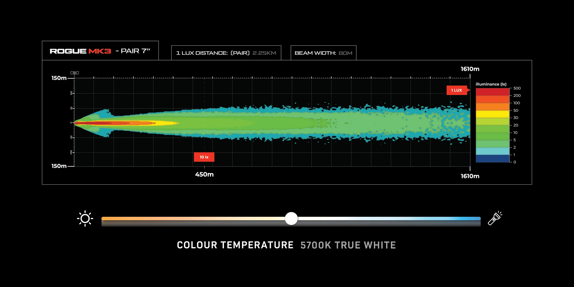 We've updated the chip in our Rogue MK3 Driving Lights to deliver an extraordinary combination of distance and spread with a seamless blend from spot to spread. Equipped with Osram Boost Oslon 7W Chips and innovative Hybrid Optics reflectors, this is our most comprehensive output pattern yet, ensuring optimal illumination with a 150° spread reaching over 150 meters wide at 350 meters. With the new chip, the Rogue Mk3's achieve an impressive 1 lux at over 1.4km, making them stand out in the market. This enhancement is not just about distance; our new chip maximises brightness across the spread portion of the beam pattern, offering unparalleled visibility to the sides. This improves safety and confidence during nighttime driving, ensuring you see more light out to the sides, just like in the distance. With the Rogue MK3, you're not just getting lights; you're getting a new standard of illumination.