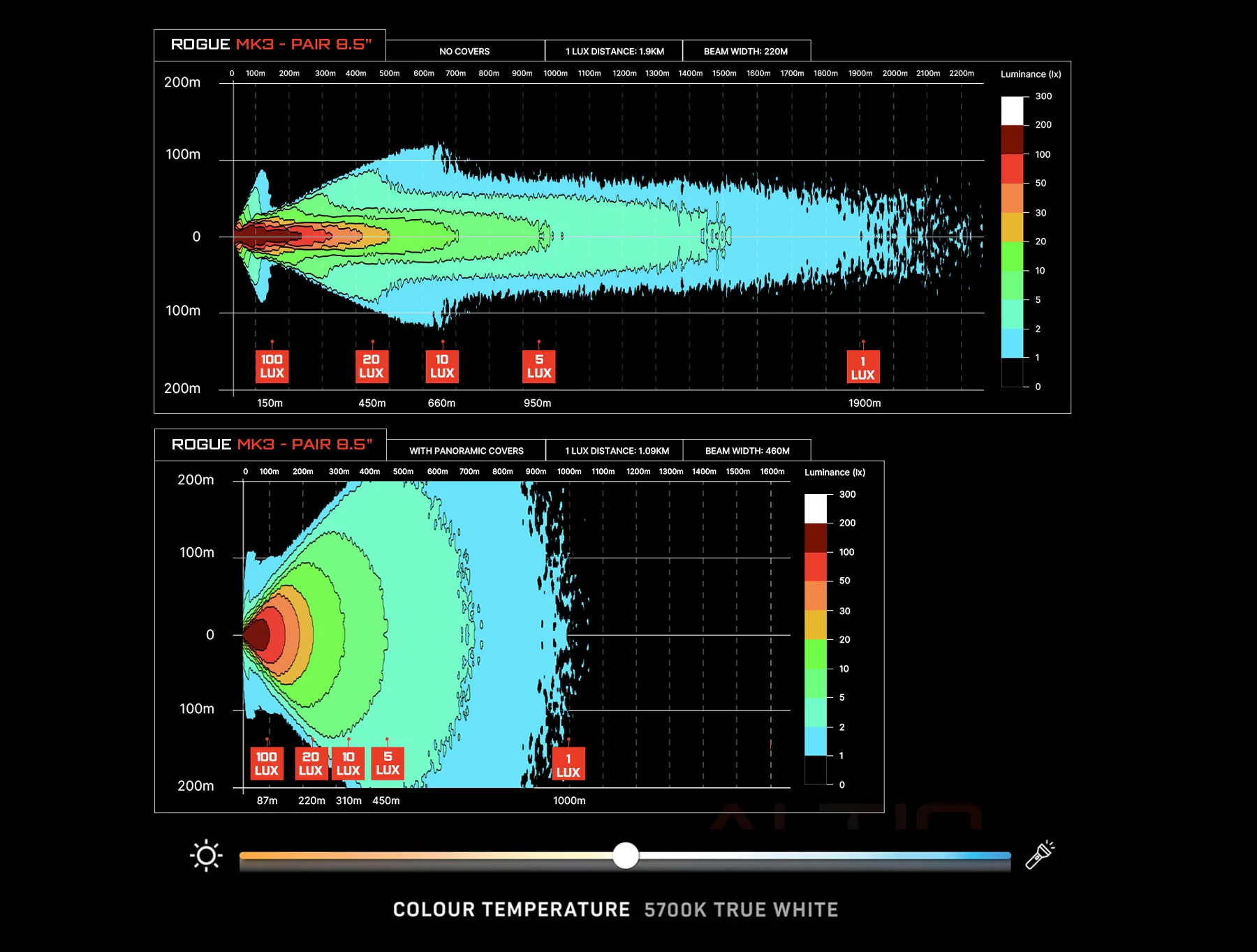 We've updated the chip in our Rogue MK3 Driving Lights to deliver an extraordinary combination of distance and spread with a seamless blend from spot to spread. Equipped with Osram Boost Oslon 7W Chips and innovative Hybrid Optics reflectors, this is our most comprehensive output pattern yet, ensuring optimal illumination with a 150° spread reaching over 150 meters wide at 450 meters. With the new chip, the Rogue Mk3's achieve an impressive 1 lux at over 1.9km, making them stand out in the market. This enhancement is not just about distance; our new chip maximises brightness across the spread portion of the beam pattern, offering unparalleled visibility to the sides. This improves safety and confidence during nighttime driving, ensuring you see more light out to the sides, just like in the distance. With the Rogue MK3, you're not just getting lights; you're getting a new standard of illumination.
